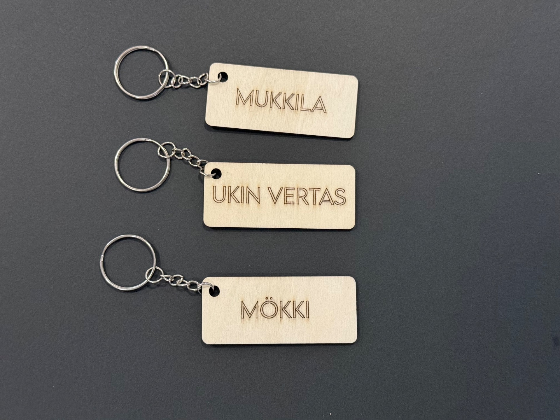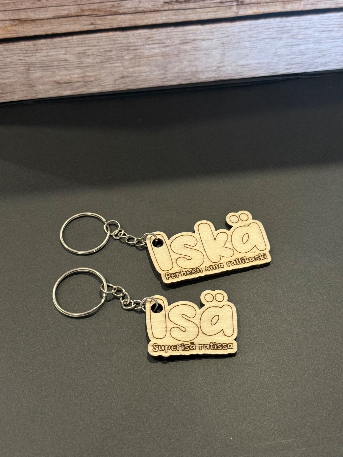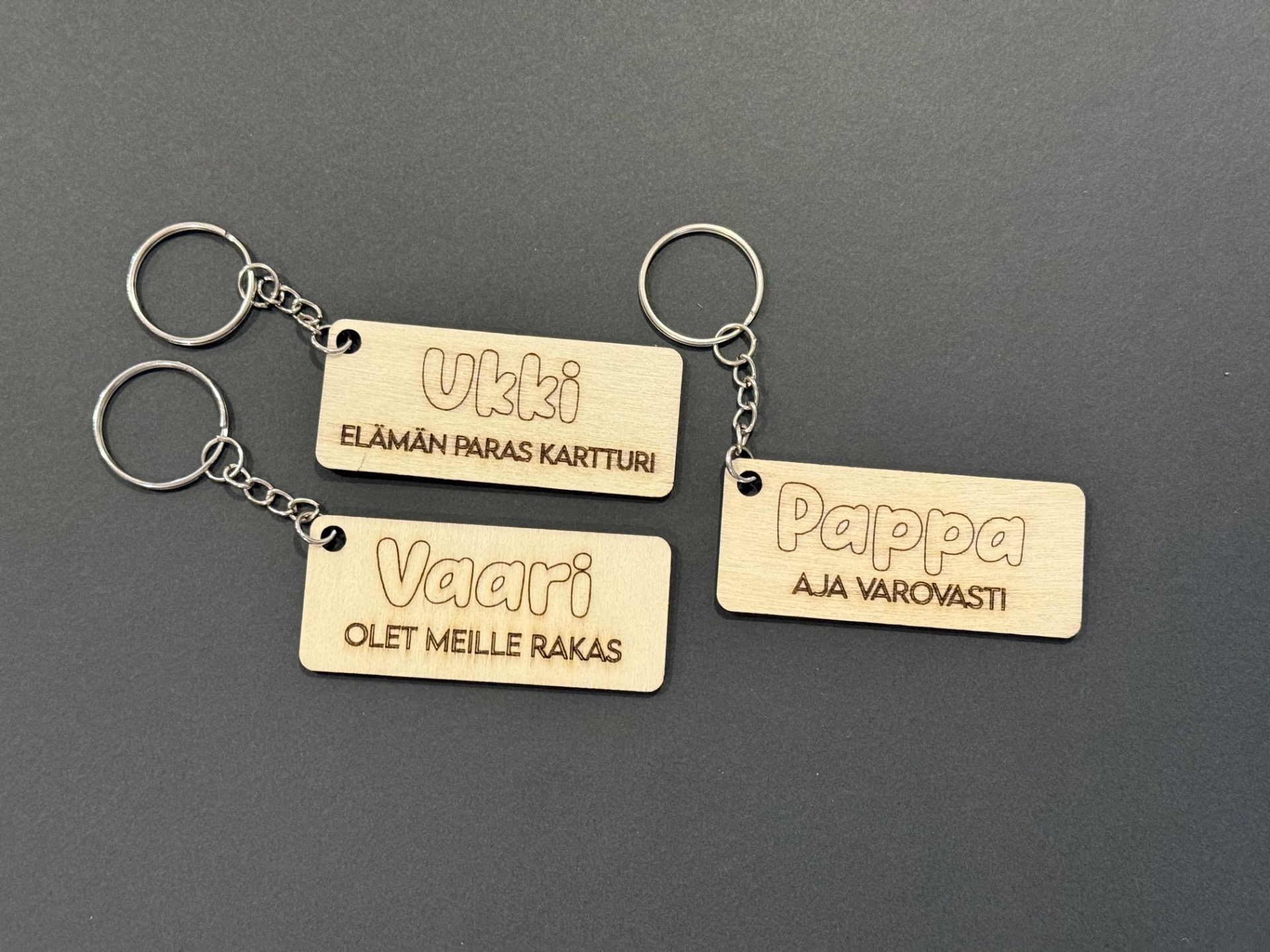 Avaimenperät erilaisilla teksteillä on käytännöllinen lahja, esimerkiksi isänpäivään. Avaimenperät ovat valmistettu Suomessa 3mm vanerista.