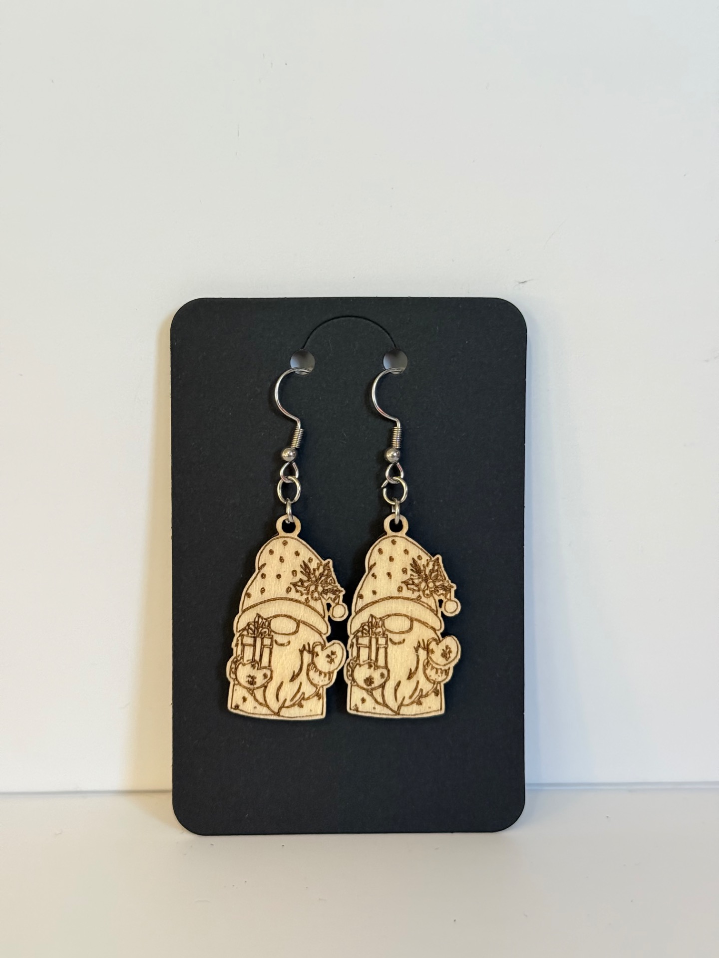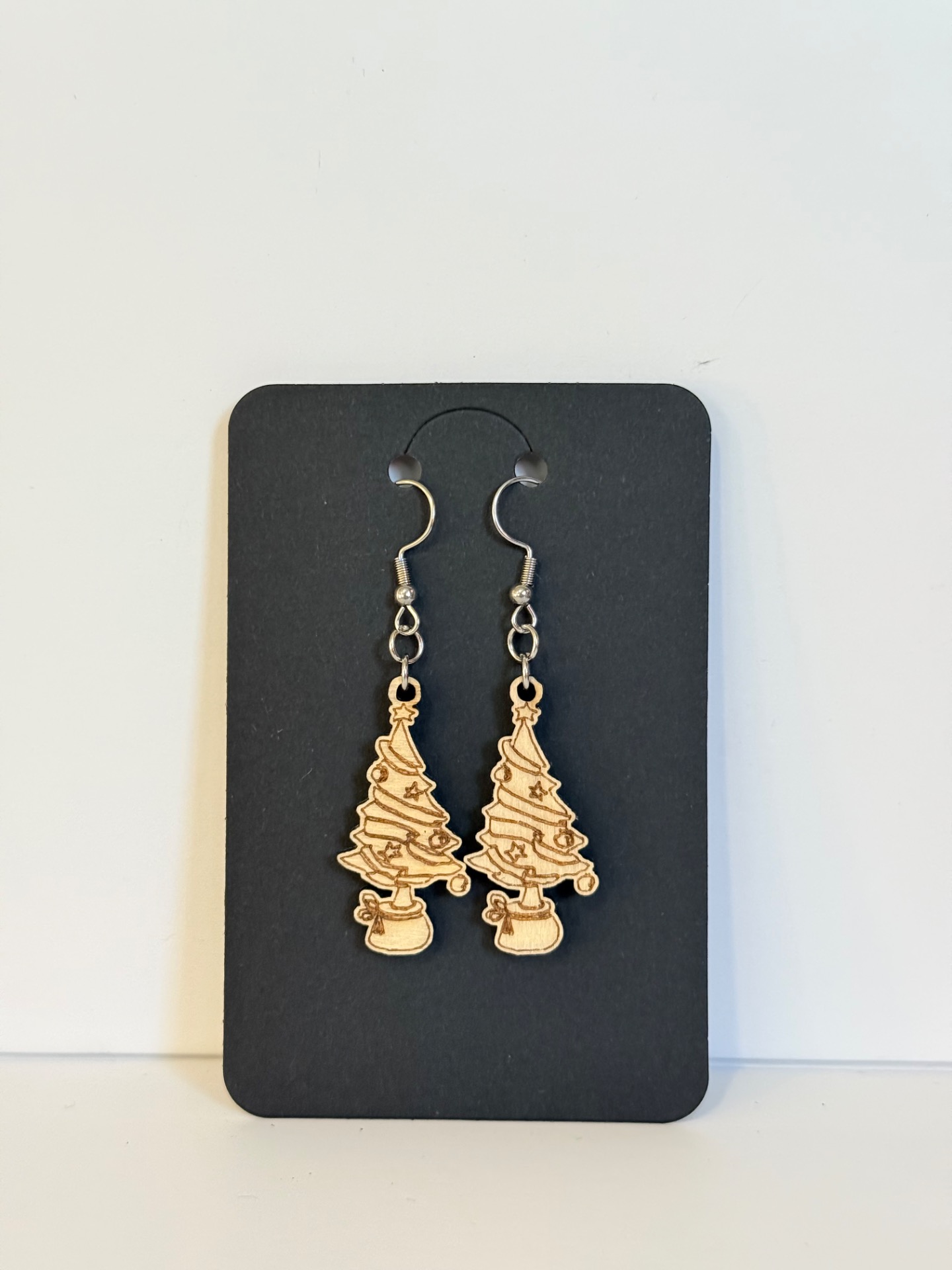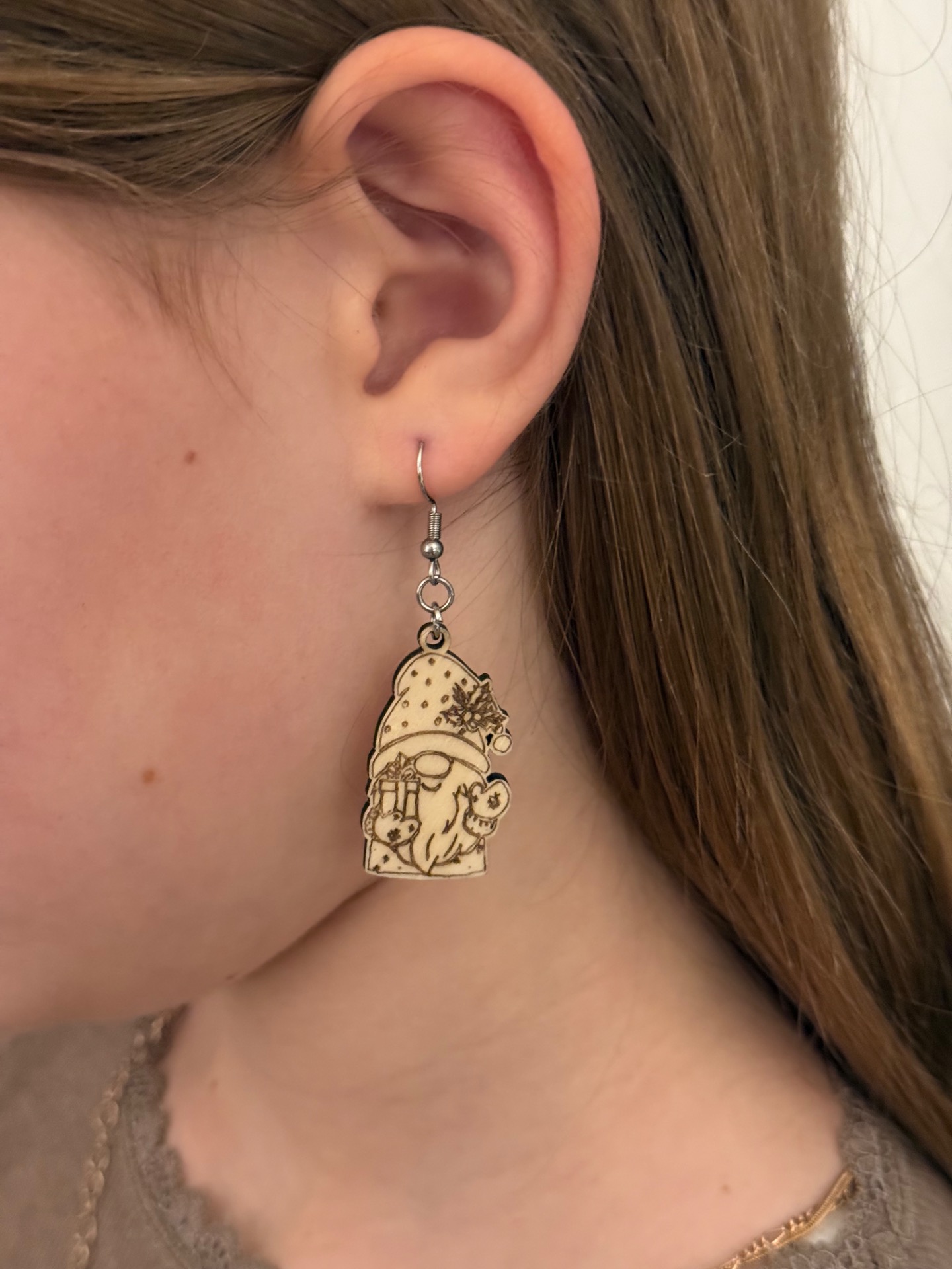 Vanerista valmistetut jouluiset korvakorut. Korvakorun koukut on valmistettu ruostumattomasta teräksestä.