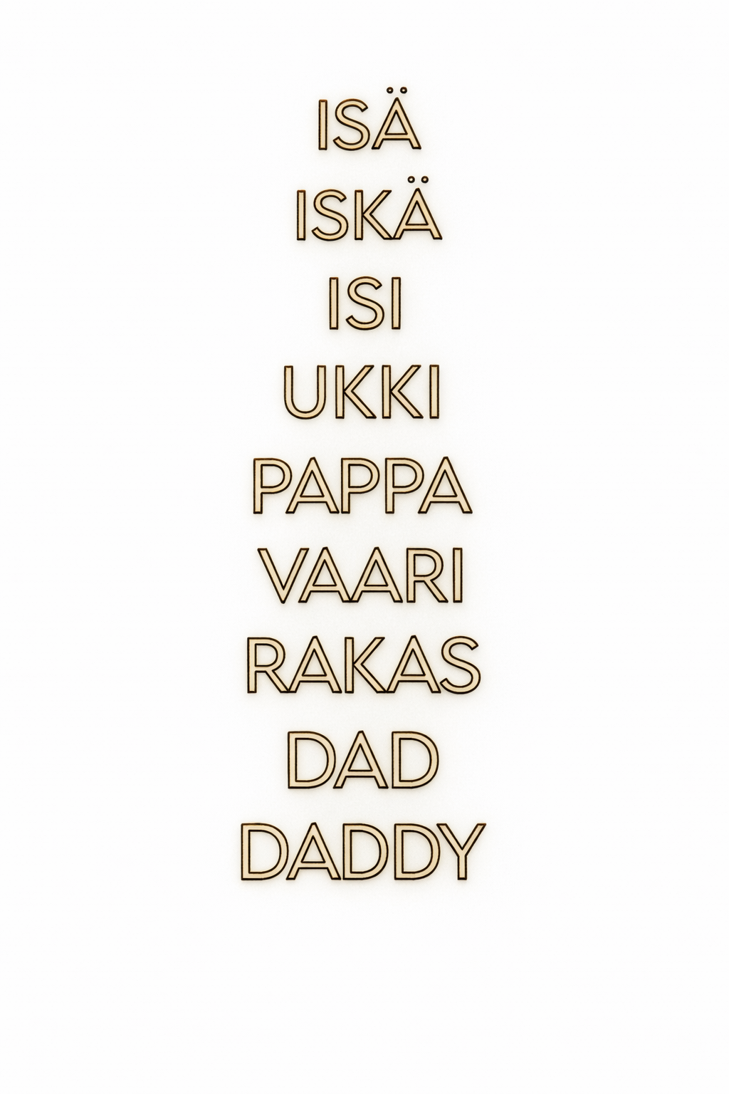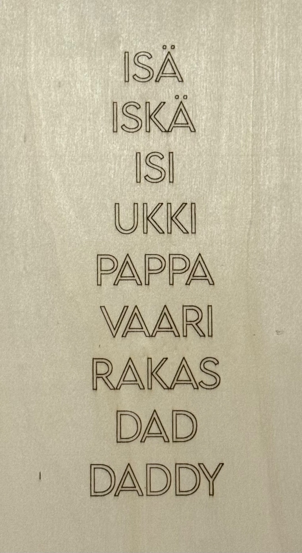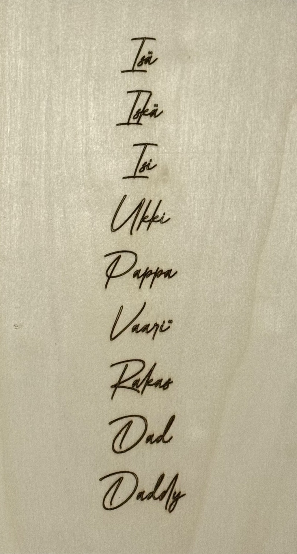 Saatavana: isä, iskä, isi, ukki, pappa, vaari, rakas, dad ja daddy. Löydät kaikki vaihtoehdot kahdessa eri fontissa, mutta halutessasi teemme tilaustuotteena myös omalla fontillasi.