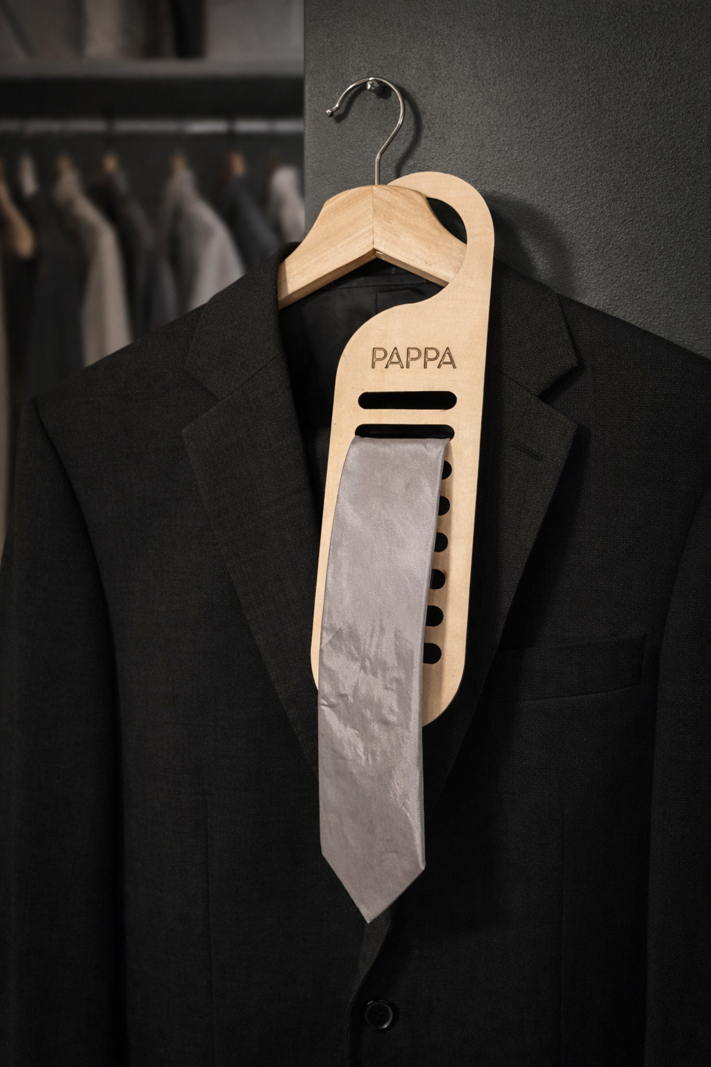 Tyylikäs ja käytännöllinen lahja isälle, isoisälle, puolisolle tai kenelle tahansa solmion käyttäjälle. Suomessa valmistettuun solmiohenkariin mahtuu 8 solmiota ja se on valmistettu 3mm vanerista.